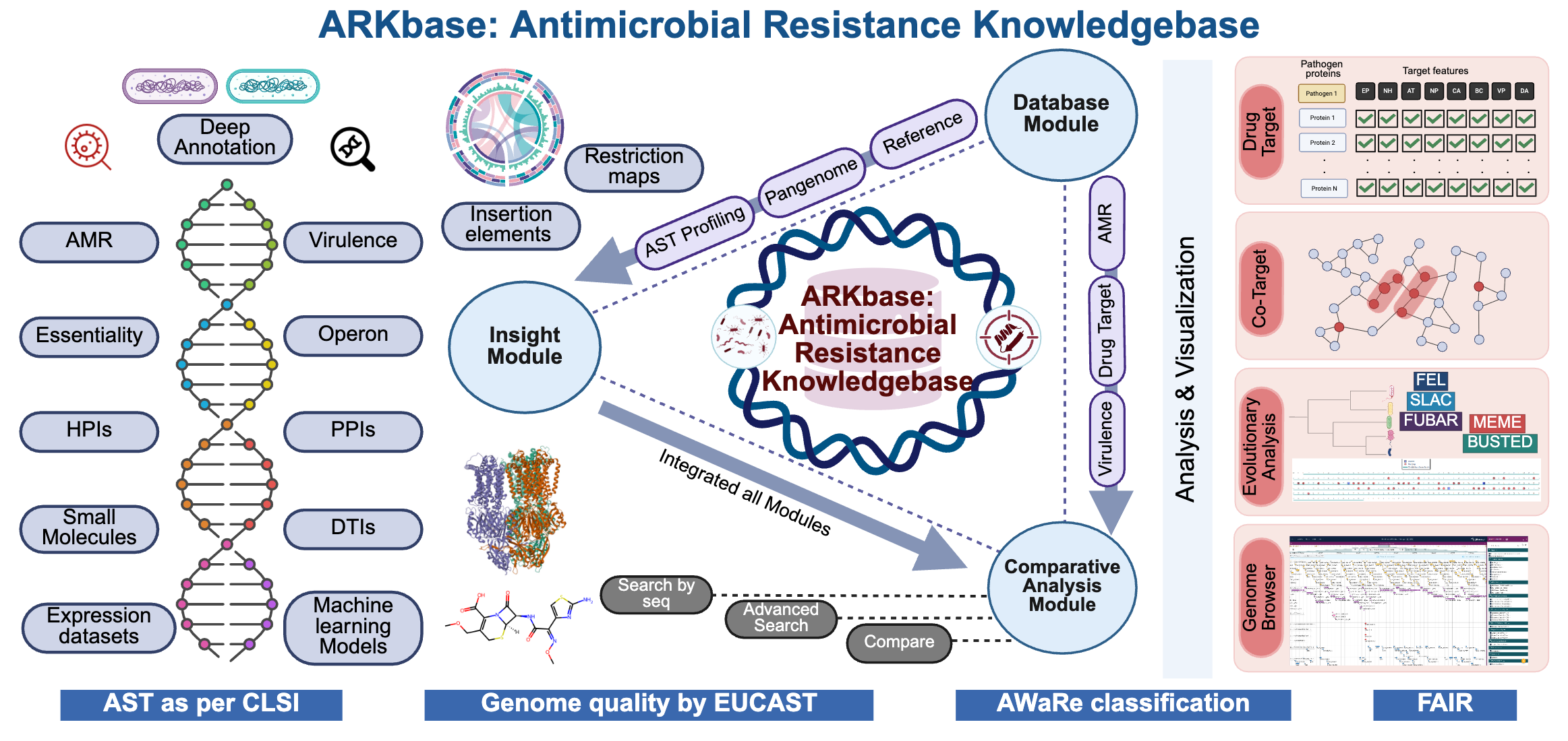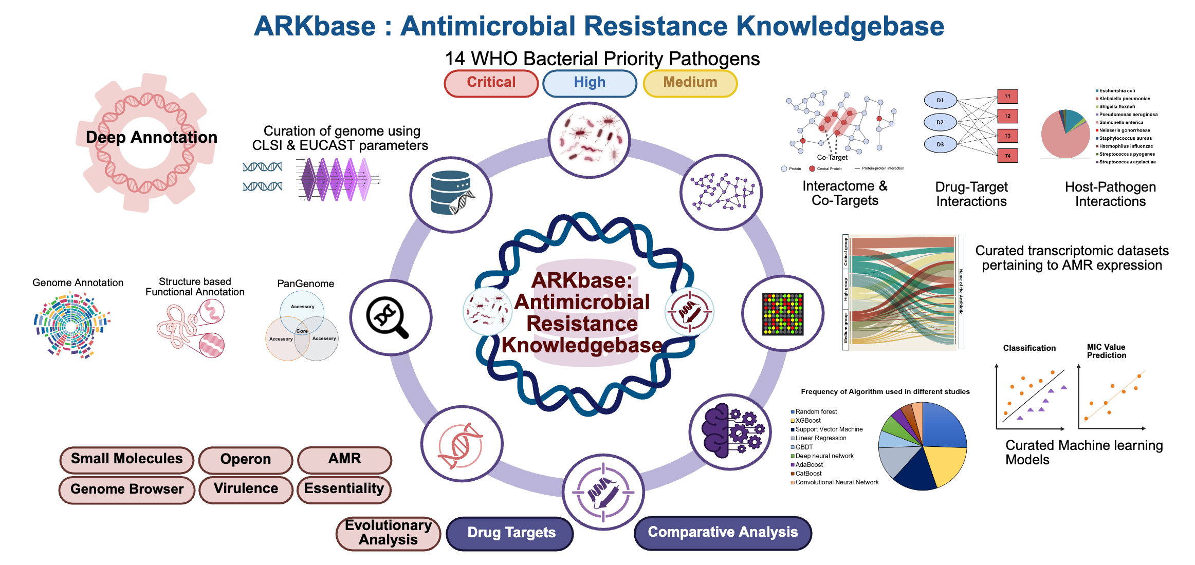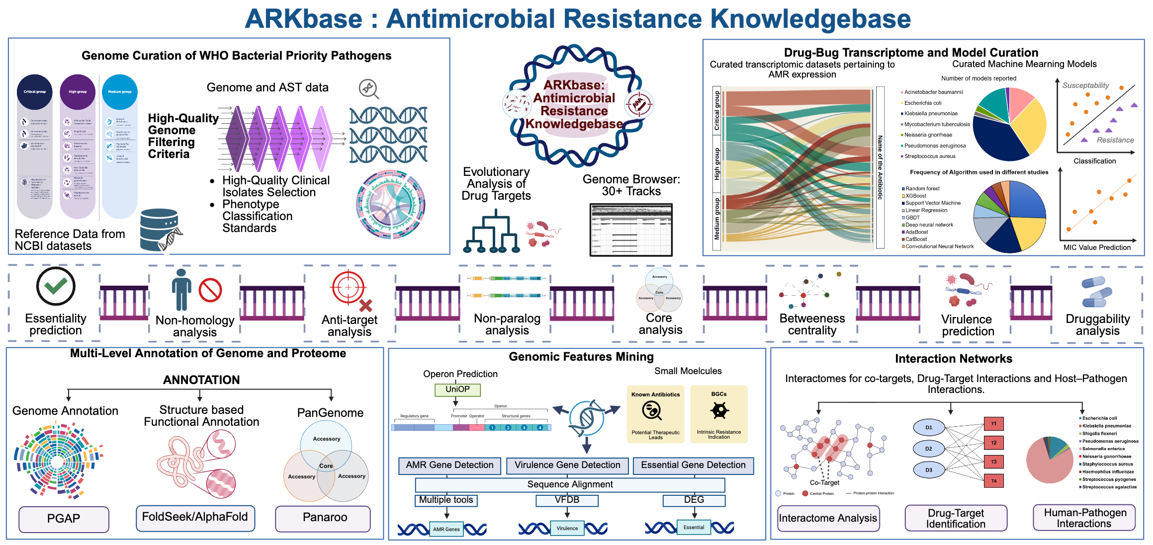 ARKbase is the largest dedicated resource for WHO bacterial priority pathogens, integrating high-quality genomes, proteomes, AMR genes, and comprehensive datasets including biosynthetic gene clusters, drug targets, antibiotic profiles, gene expression data and machine learning models. This centralized platform assists in understanding resistance mechanisms and supports targeted drug discovery for AMR.